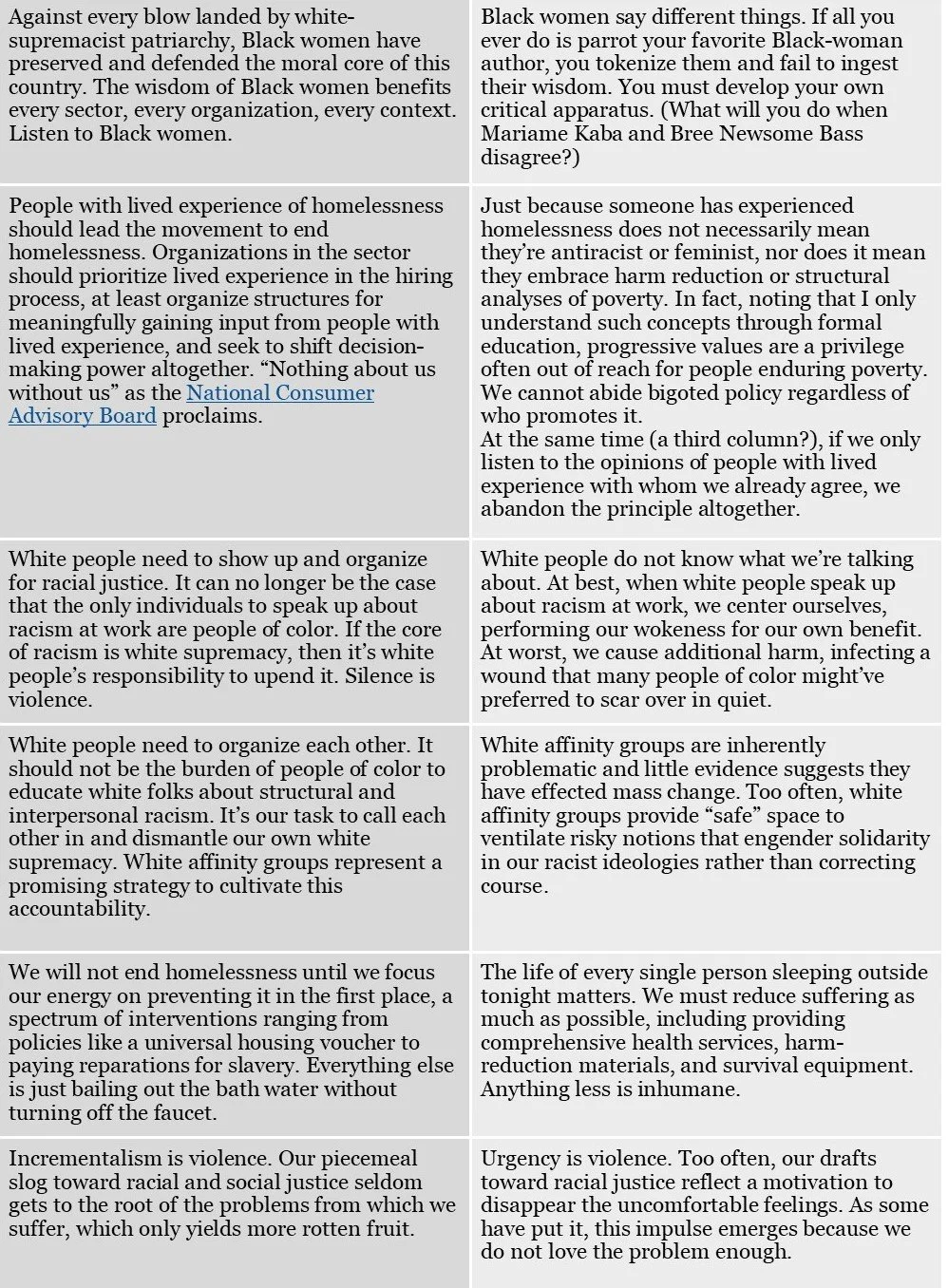 Bothness, on the other hand, perceives these opposites not as tug-of-war but like stilts, where rescue requires both, and indeed forward motion facilitates such balance much better than stagnation. Bothness declares, in the above example, that representation is necessary and insufficient. Nonprofits will scarcely embody anything akin to racial justice when comprising mostly white people and lived experience of racism does not equate to antiracist analysis. Both.